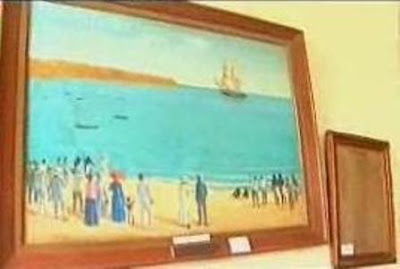 Óleo onde se pode ver a baía de Moçâmedes, a Ponta do Pau do Sul, uma caravela e muito povo na praia... Autor desconhecido (?)
