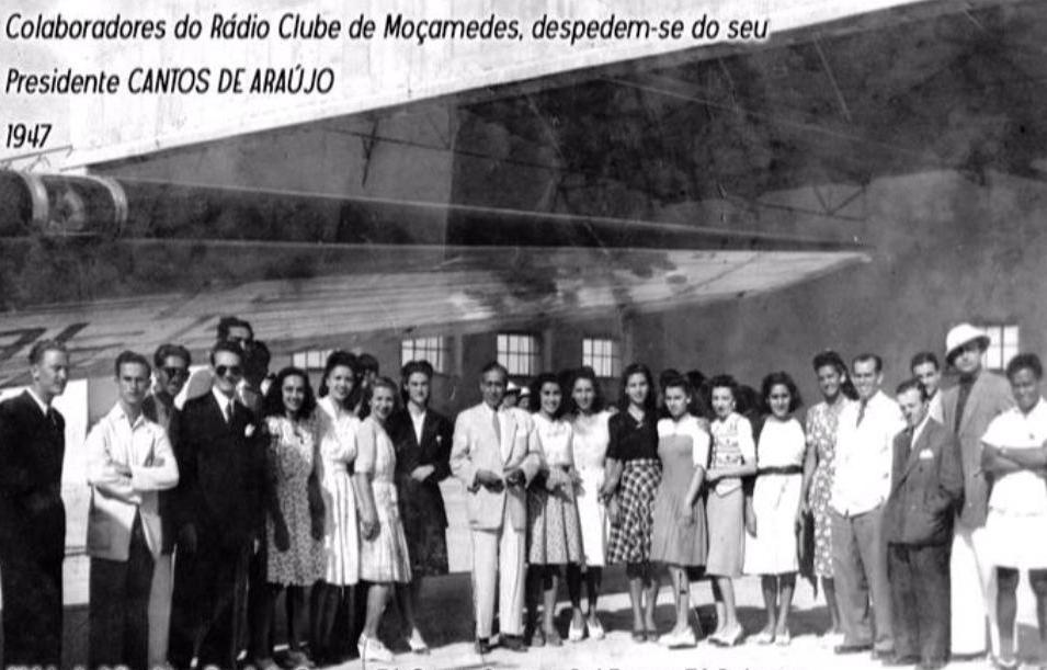 Dirigentes, locutores e colaboradores junto da sede do Rádio Clube de Moçâmedes. De de cima para baixo e da esq. para a dt : 1. Raul Gomes, Dr Marques Mano, Raul Gomes Jr. /Lito Baía, Firmo Bonvalot, Estevão Coelho, Santos César , Martins, Alfredo Falcão, Santos Osório, Pedro Malaguerra, J. Oliveira (Maboque), Evaristo Fernandes, Norberto Gouveia (Patalim), Nito Santos, Álvaro Mendes, Armando Campos, José Luís Ressurreição, José Antunes Salvador e Carlos Cristão. 2. Leonor Bajouca, Manoca, Noelma de Sousa (Esteves), Júlia Gomes, Manuela Evangelista (Carvalho), Dr Romão Machado (Pres. do RCM) e esposa, Maria Manuela Bajouca, Julieta Bernardino, Lili Trabulo, Maria Emilia Ramos, Arminda Alves de Oliveira (pianista) e Rosa Bento (César), pianista. Foto Salvador.