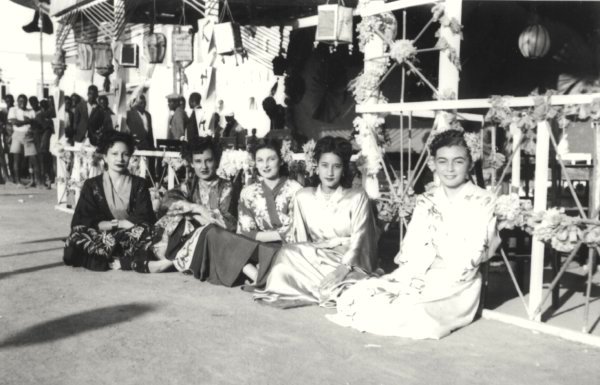 Esta foto, tirada junto do pavilhão-bar, representa um grupo de colaboradoras de vários pavilhões. Foram elas, da esq. para a dt: Julinha Pestana (China), Alice Castro (fantasia/fada), Orbela Guedes (Holanda), Manuela Bajouca (fantasia/fada), Fátima Cunha (Holanda), ?, Zuleika (China), Celeste/Carracinha (fantasia/aero-moça), Lizete Ferreira (China), Néné Oliveira (fantasia/aero-moça), Etelvina Ferreira (Holanda), Rute Gomes (fantasia/aero-moça), Maria Helena Ramos (Holanda), Teresa Ressurreição (fantasia/fada), Maria Parreira (fantasia/aero-moça), ?.