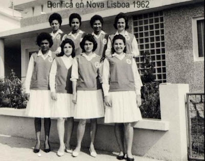 O Benfica em Nova Lisboa. Da esq. para a dt.: Em cima: Elsa Bernardino, Xana, ? e Elizabete Bagarrão (Bétinha). Embaixo: Minelvina (veterana), Marísia Pestana, Amélia Castro e ?