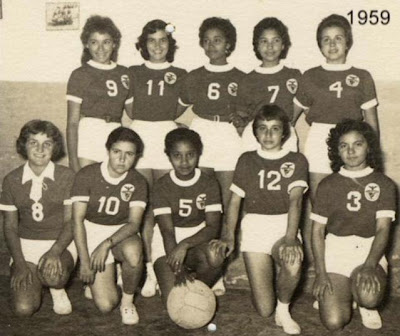 A equipa do Benfica de 1962. Em cima, da esq. para a dt: Minelvina Cruz (veterana), Xana, Amélia Castro e ? Embaixo: Elsa Bernardino,?, Mª Elizabete Ilha Bagarrão (Betinha) e ?. Também aqui seria necessário uma ajuda na identificação das atletas...