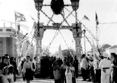 Junto deste arco erguido na Avenida Felner (a avenida sobranceira ao mar que começa no Palácio e liga a baixa da cidade à Torre do Tombo), podemos ver,  alguns dos moradores  aguardam a chegada da imagem: Joaquim Gregório, Violete Velhinho, o casal Rosarinha e António Paulo (António da Rita), o casal Francisco Velhinho e Mariete, o casal Gregório e Maria do Rosário e ti Silva. Foto do livro  Recordar Angola, 2º volume, de Paulo Salvador.
